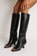 Crafted from faux leather with a crocodile-embossed finish, these knee-length boots feature a dramatic peep toe, thick slanted heel, and sculptural silhouette. Designed for fashion-forward spring/summer styling, they bring statement energy to the season’s standout looks.