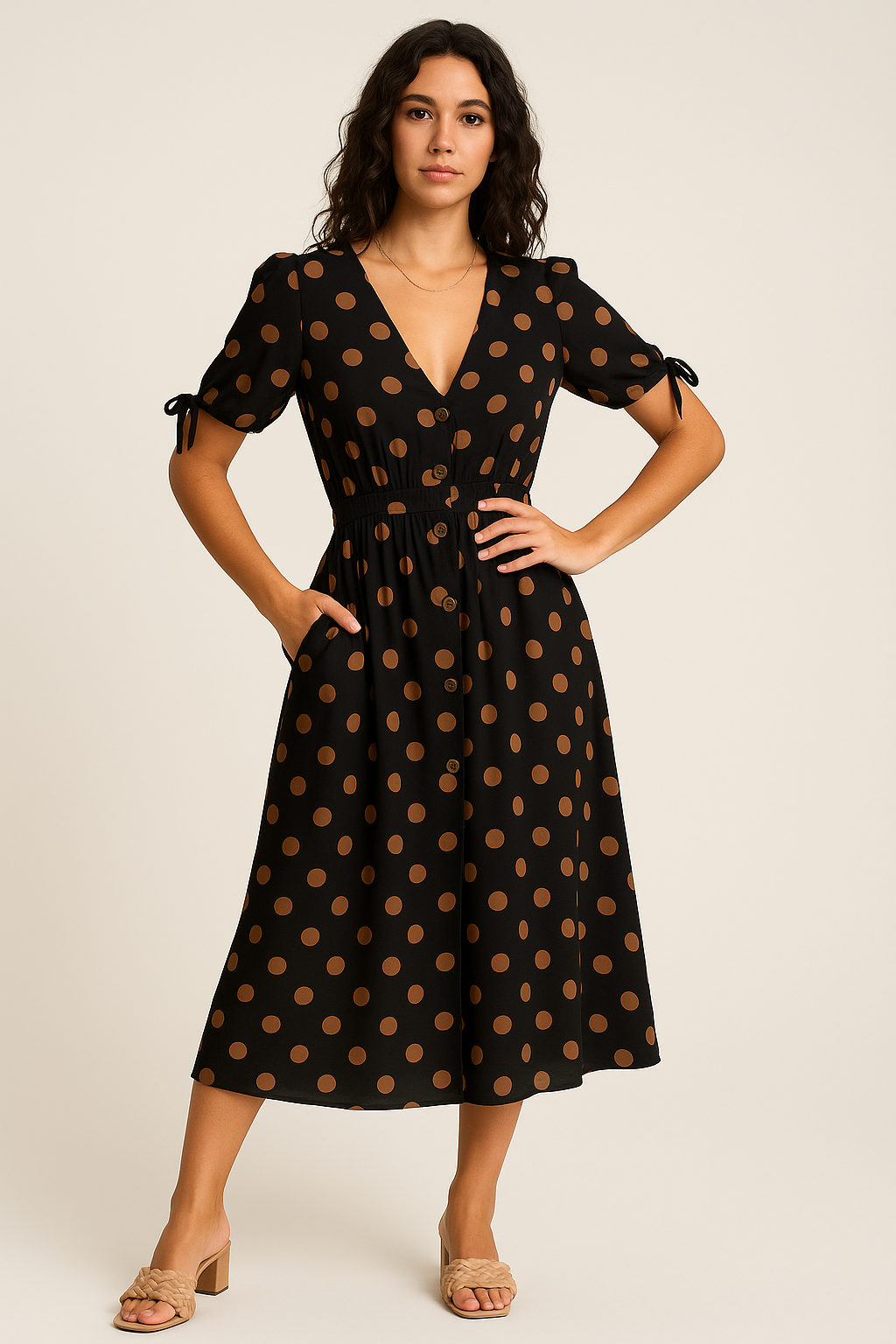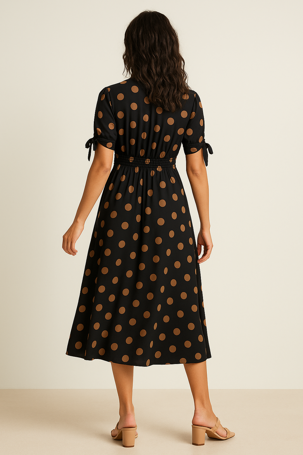 Elevate your wardrobe with this effortlessly chic Polka Dot Midi Dress. Crafted from lightweight, flowing fabric, it features a flattering V-neckline with functional front buttons and soft gathers under the bust for a feminine silhouette. Elbow-length sleeves tie at the cuffs for a playful touch, while the full, swishy skirt falls to mid-calf for timeless elegance. Rendered in classic black adorned with warm tan polka dots, this dress pairs beautifully with sandals or heels, perfect for brunch dates, garden parties, or weekend getaways.