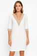 Light, effortless, and refined. This V-neck dress in a breathable linen blend features delicate lace trim and relaxed ¾ sleeves — made for warm-weather ease.