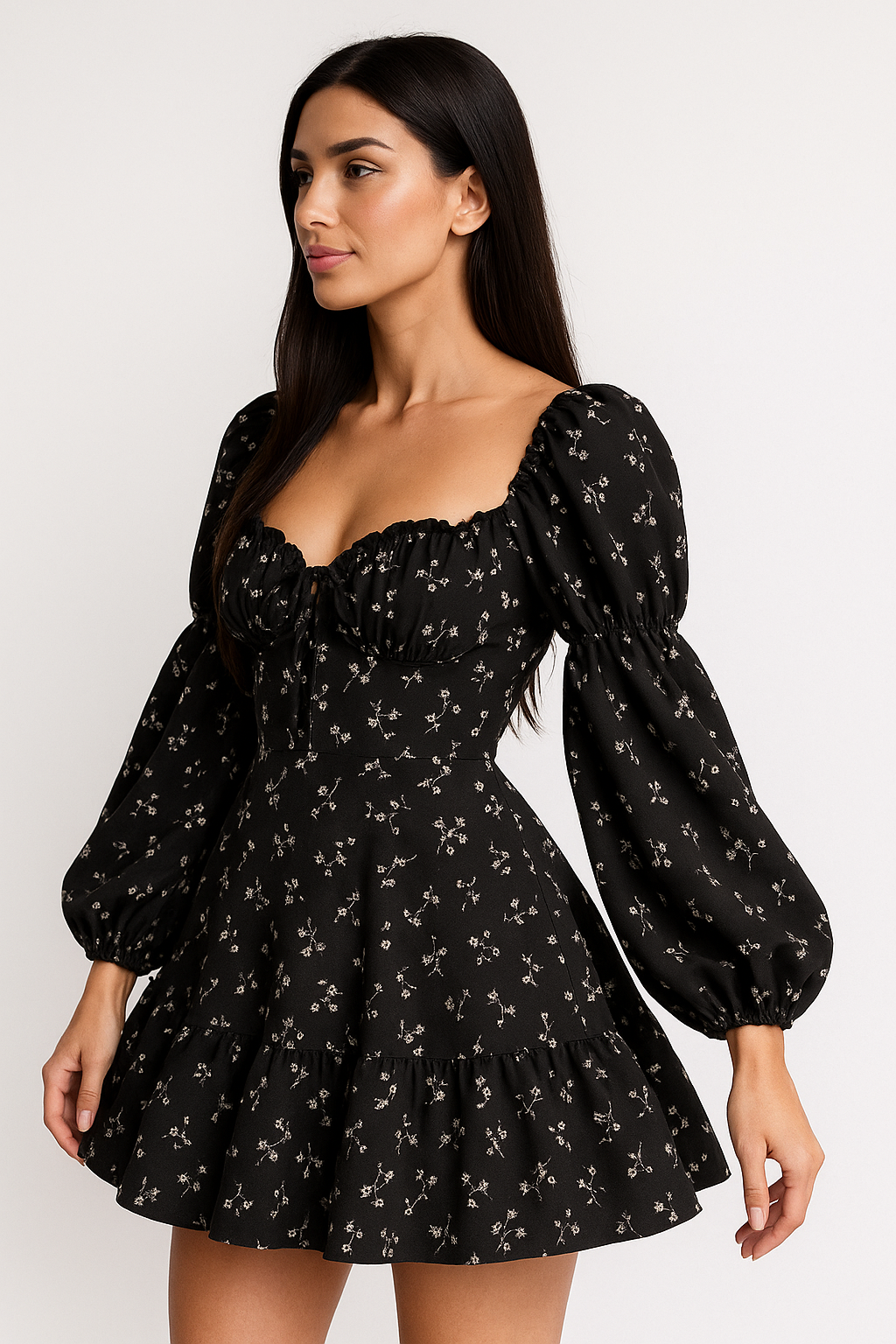 This romantic floral dress features voluminous puff sleeves, a structured square neckline, and an open-back design. With a soft, flowing silhouette, it’s perfect for garden parties, brunches, or summer evenings.