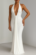 Make an unforgettable entrance with this sultry halter maxi dress, defined by its deep V-neckline, open back, and artful ruching. Designed to contour and flow, the draped silhouette exudes confidence and elegance perfect for summer nights, club events, and upscale parties.