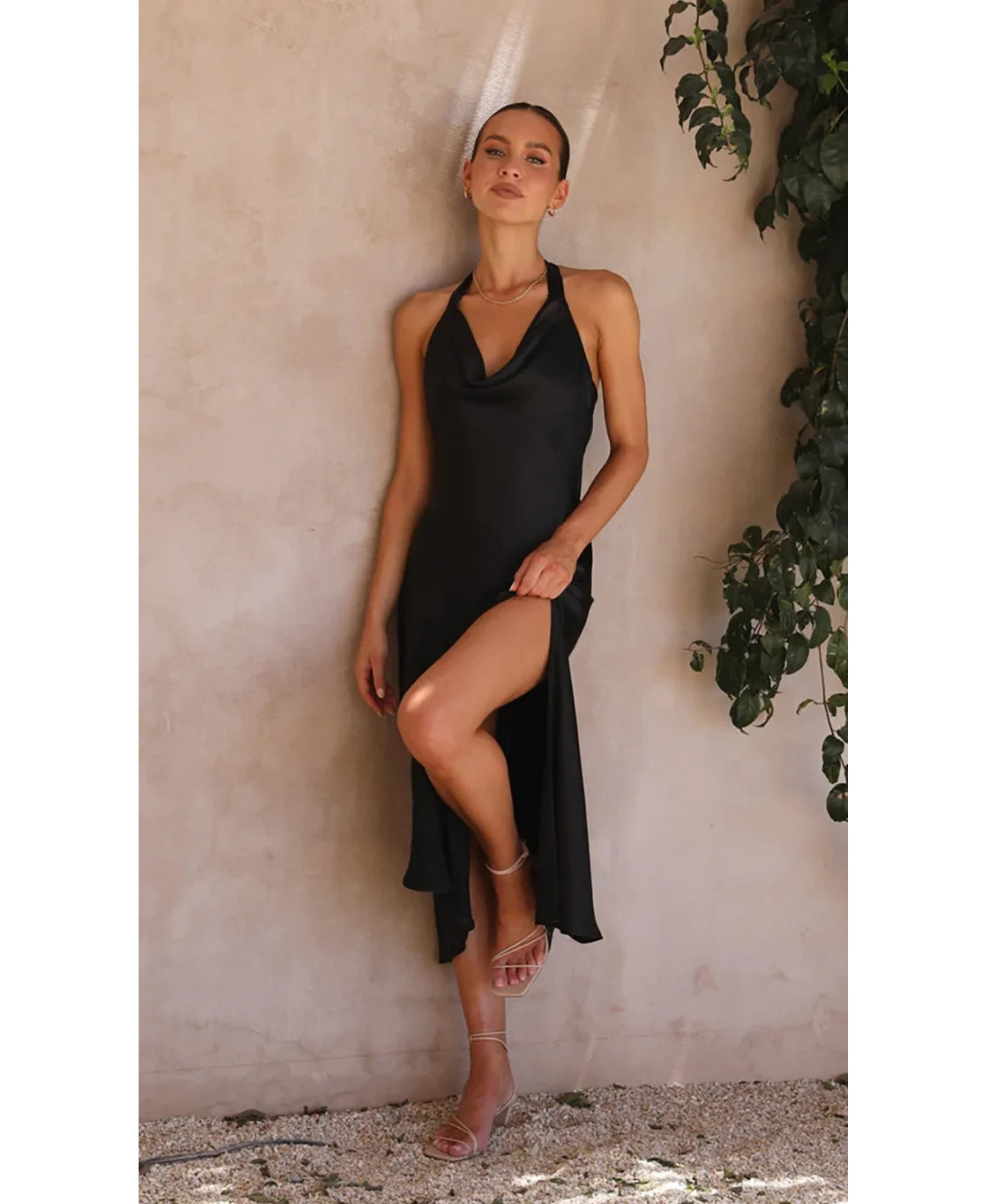 Command the room in the Noir Allure Satin Halter Slip Dress, a masterclass in elegance, confidence, and sensual minimalism. Crafted from soft, high-shine satin, this timeless black beauty features a draped cowl neckline and halter straps that frame the shoulders with graceful ease. The figure-skimming silhouette flows into a bold thigh-high slit, offering just the right amount of drama with every step.