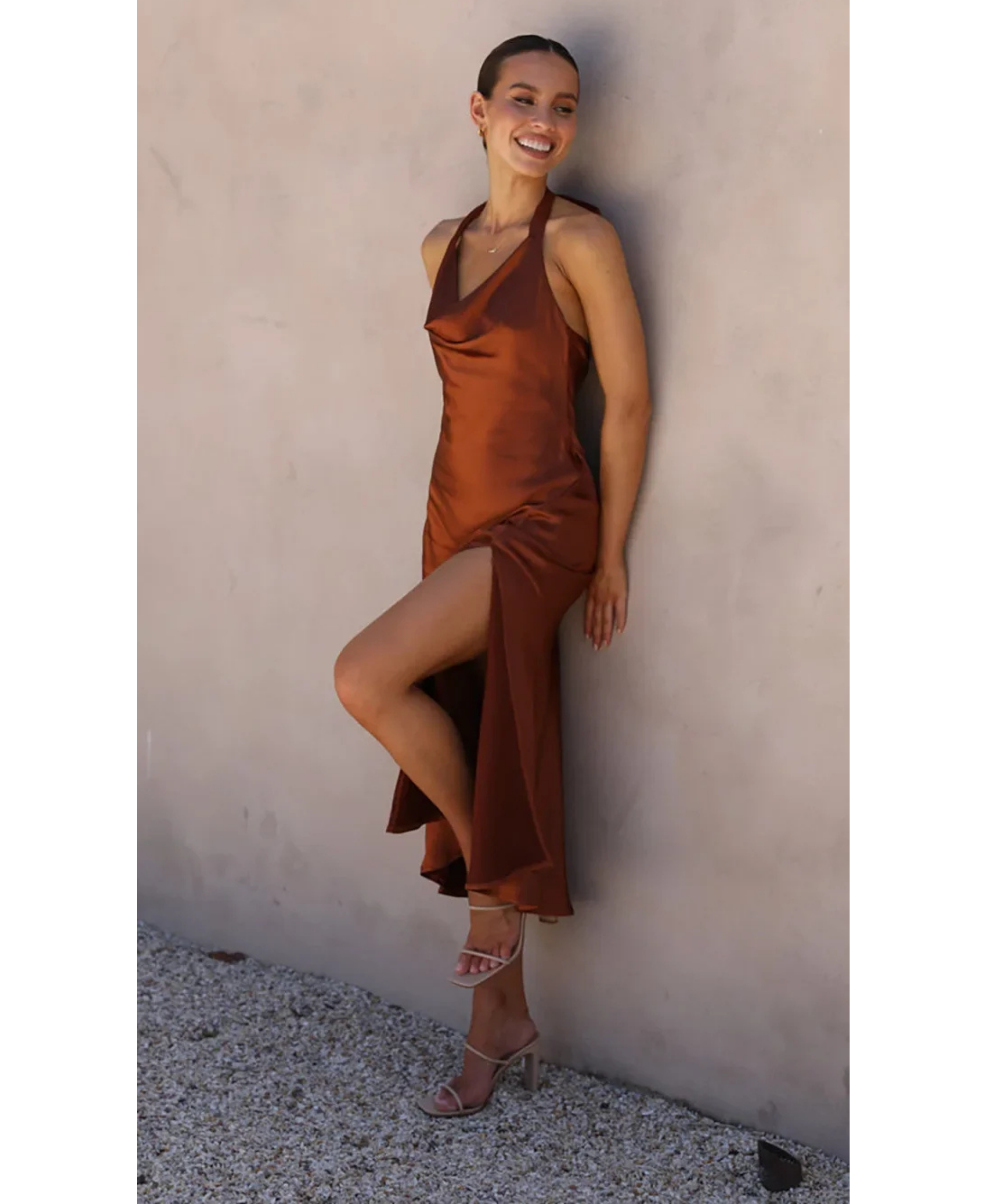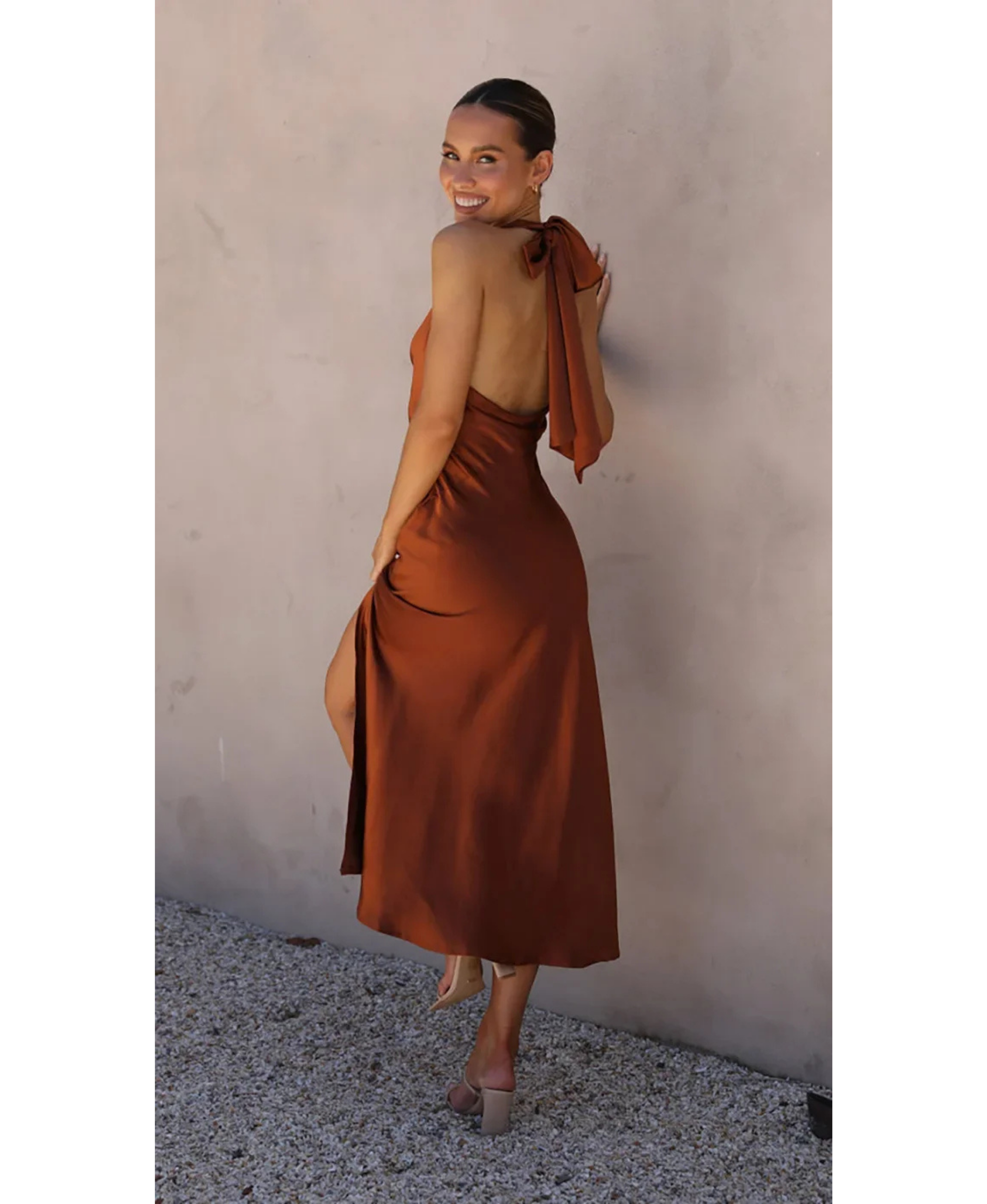 The open back adds an alluring touch, while the fluid fabric caresses your body like a second skin, gliding effortlessly from dinner dates to evening events, or wherever the night may lead. Whether styled with delicate heels or statement jewels, this piece promises sophistication with attitude.