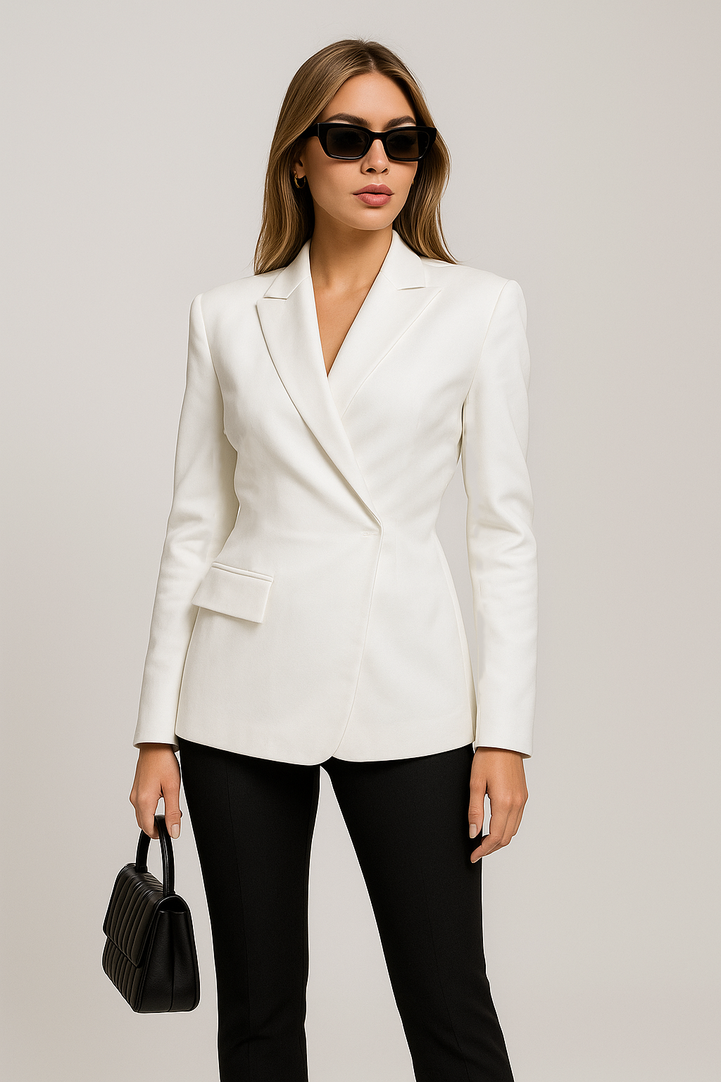 Elevate your seasonal wardrobe with this structured autumn blazer. Featuring long sleeves, a classic notched collar, and sleek backless detailing, it’s tailored for a flattering fit and includes discreet front pockets for function. Crafted for both daytime polish and evening elegance, this versatile jacket pairs effortlessly with tailored trousers or denim.