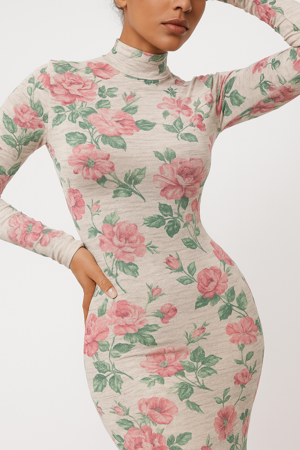 This slim-fit maxi dress features a sculpted silhouette with long sleeves, a half high collar, and a front zip detail. Designed with a subtle print and high waistline, it balances elegance and edge for elevated occasions.