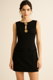 Crafted from a lightweight woven blend with slight stretch, this slim-fit mini dress features a high crew neckline, sleeveless silhouette, and bold cutout details accented with metal elements. Designed for modern nights out or elevated party wear.